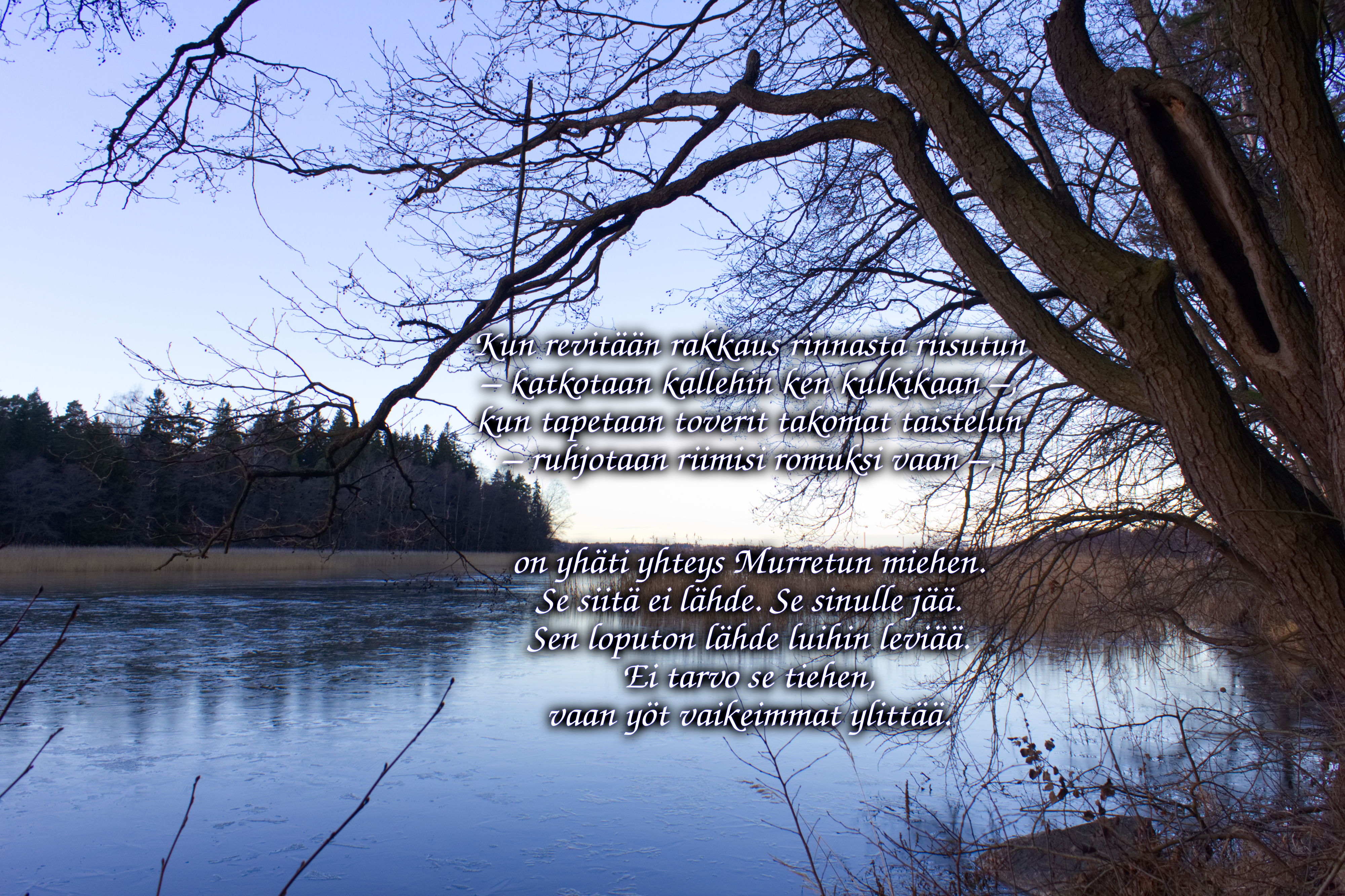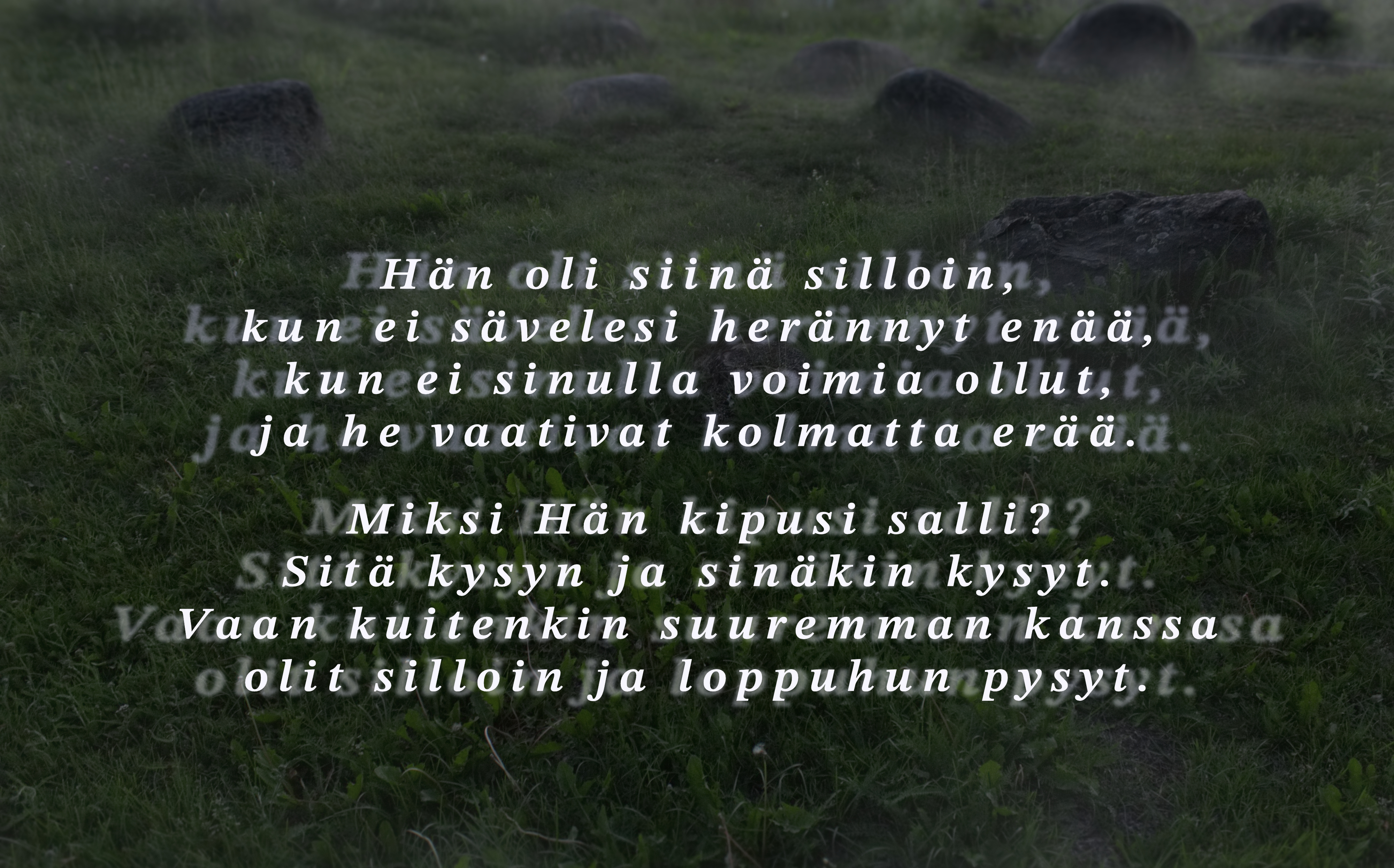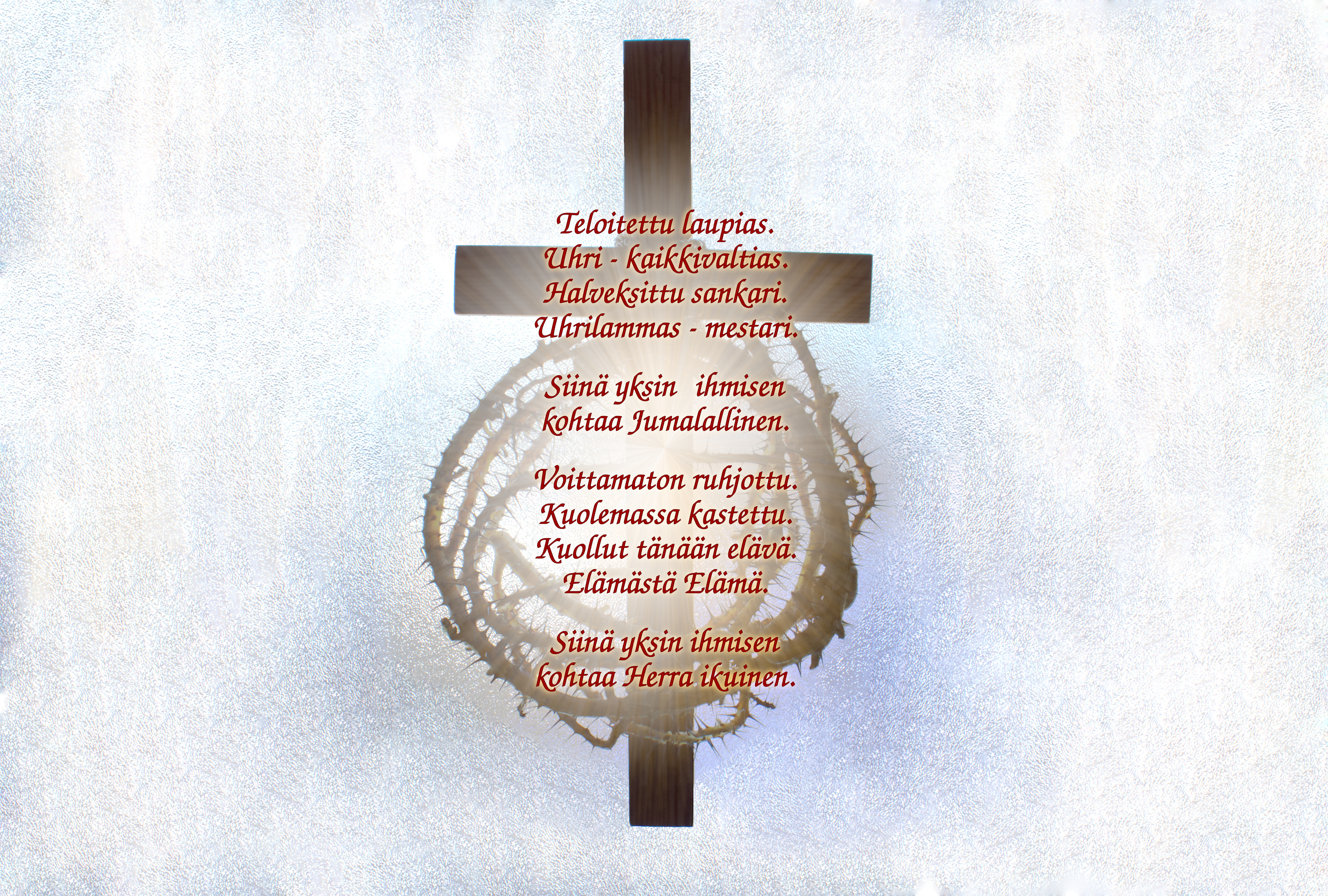 Tämä runo kuvaa paitsi epäilyksiä, kipuja ja haasteita, myös Häntä, joka kaiken kipumme on lopulta kantanut. |